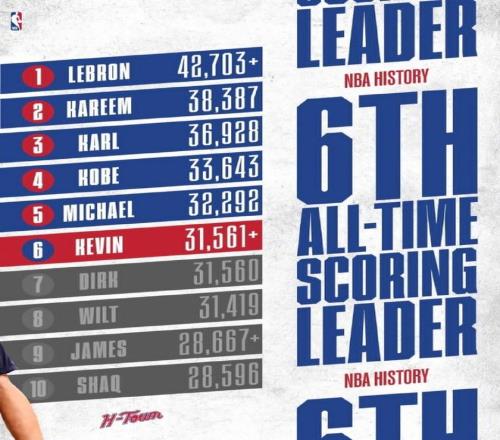 杜兰特在本赛季出战的前37场比赛,他场均得到26.3分表现出色,且过去17场比赛均得到超过17分。伴随本场杜兰特已经得到18分,他NBA生涯常规赛总得分提升到31562分,已经超越诺维茨基31560分,升至NBA历史得分榜第6位迎来里程碑。